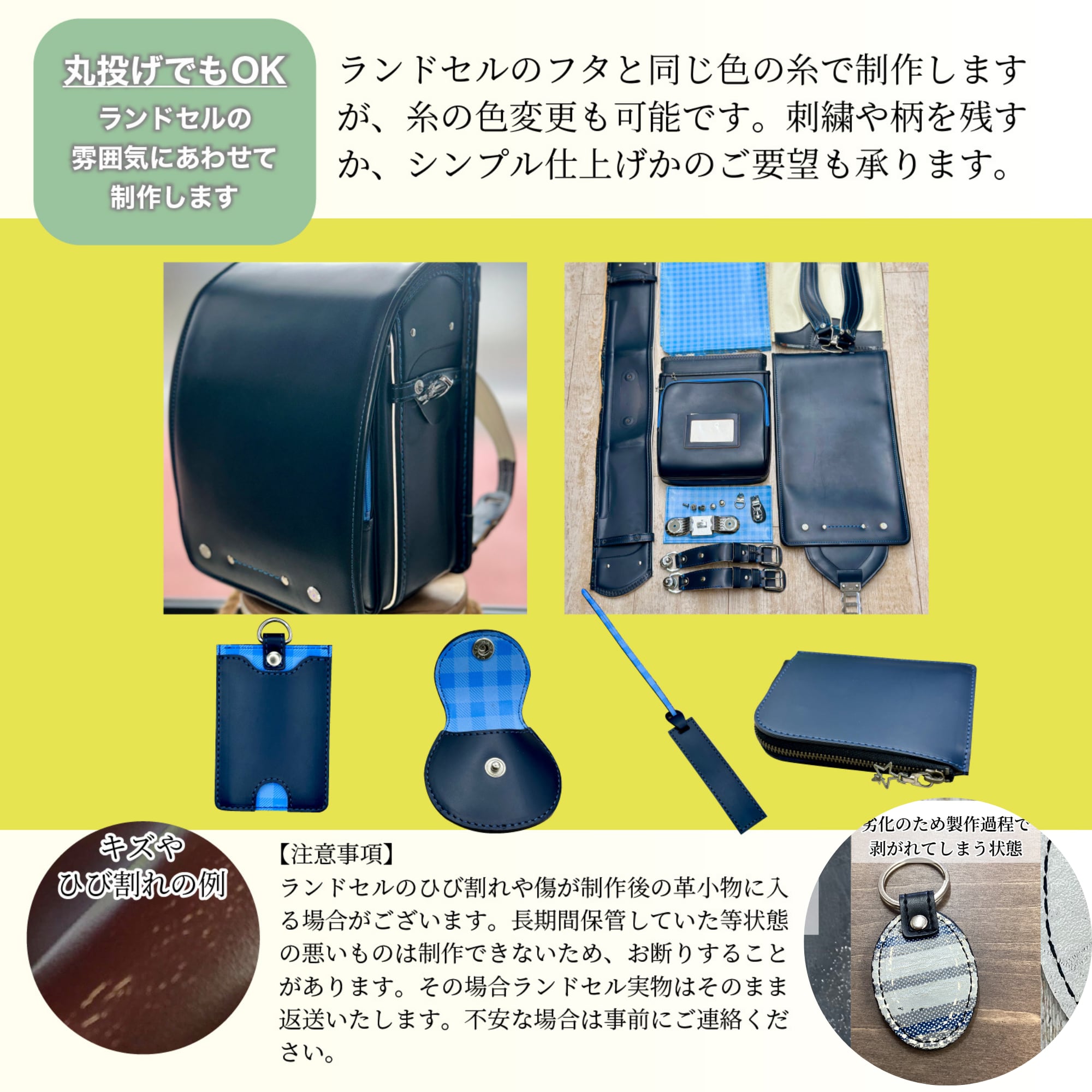 *長期間保管をしていた物や、状態の悪い物など、ランドセルを確認して製作出来ない場合がございます。(なお、その場合の返送料はお客様のご負担となりますので、ご不安でした事前にご相談ください。)