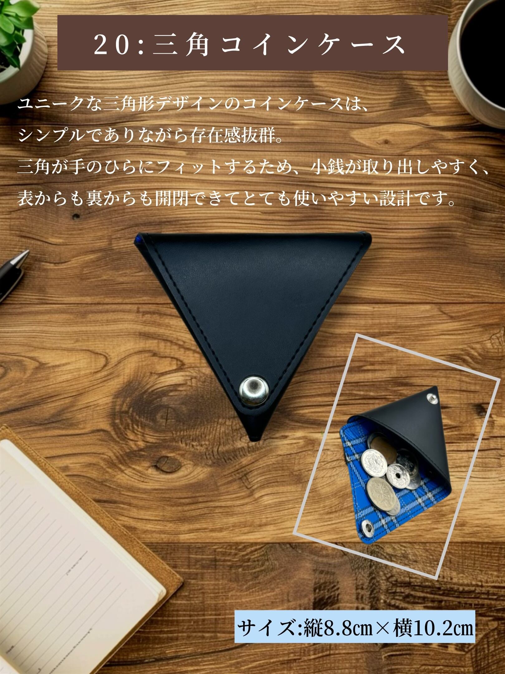 ユニークな三角形デザインのコインケースは、シンプルでありながら存在感抜群。三角が手のひらにフィットするため、小銭が取り出しやすく、表からも裏からも開閉できてとても使いやすい設計です。